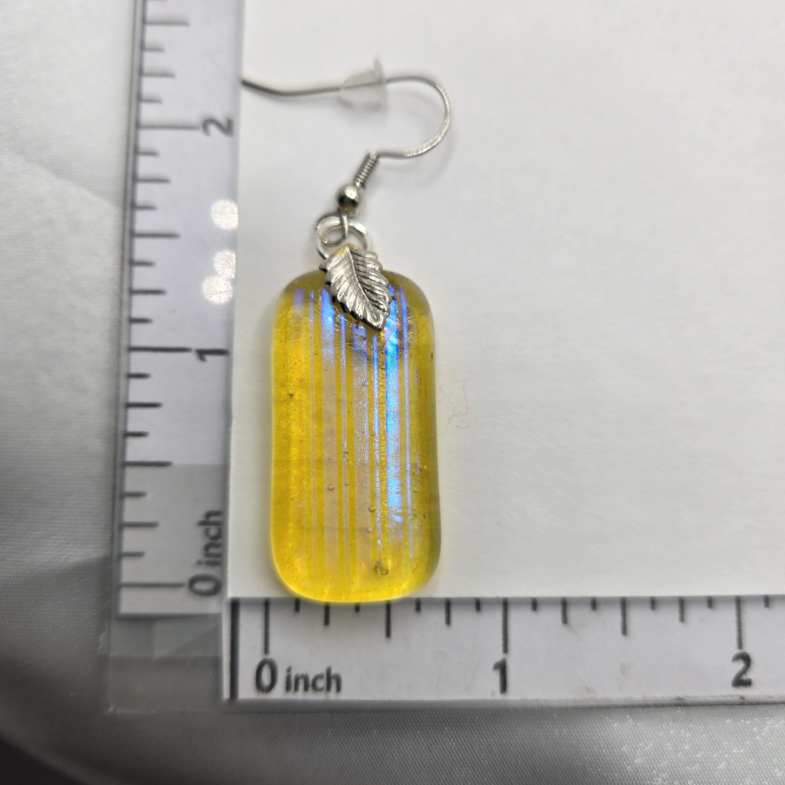 Vibrant yellow fused glass accented with soft silver‑iridescent stripes that catch the light with every movement. A delicate leaf‑shaped bail adds an elegant, nature‑inspired touch, complementing the warm glow of the glass. Lightweight, luminous, and handcrafted for a one‑of‑a‑kind finish.