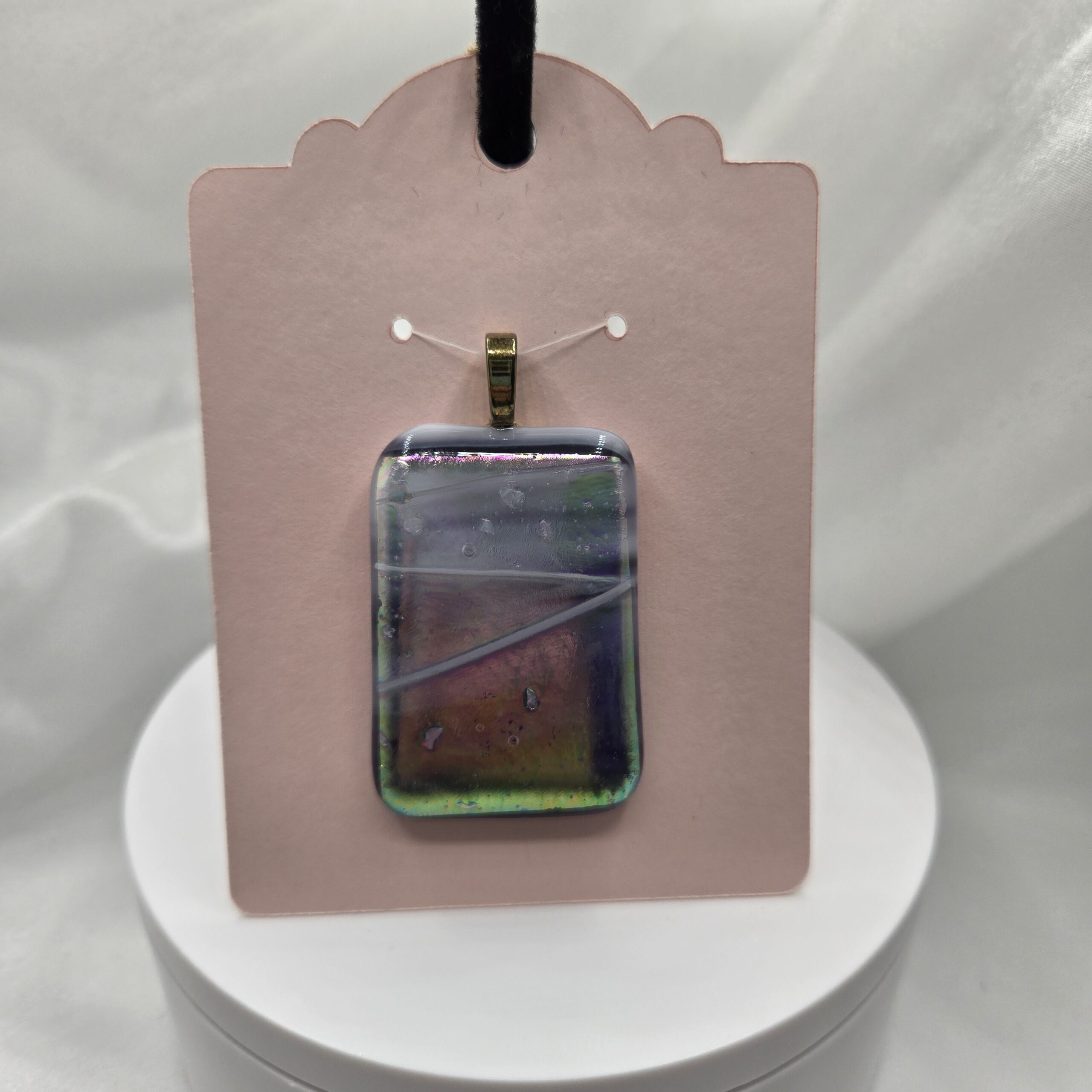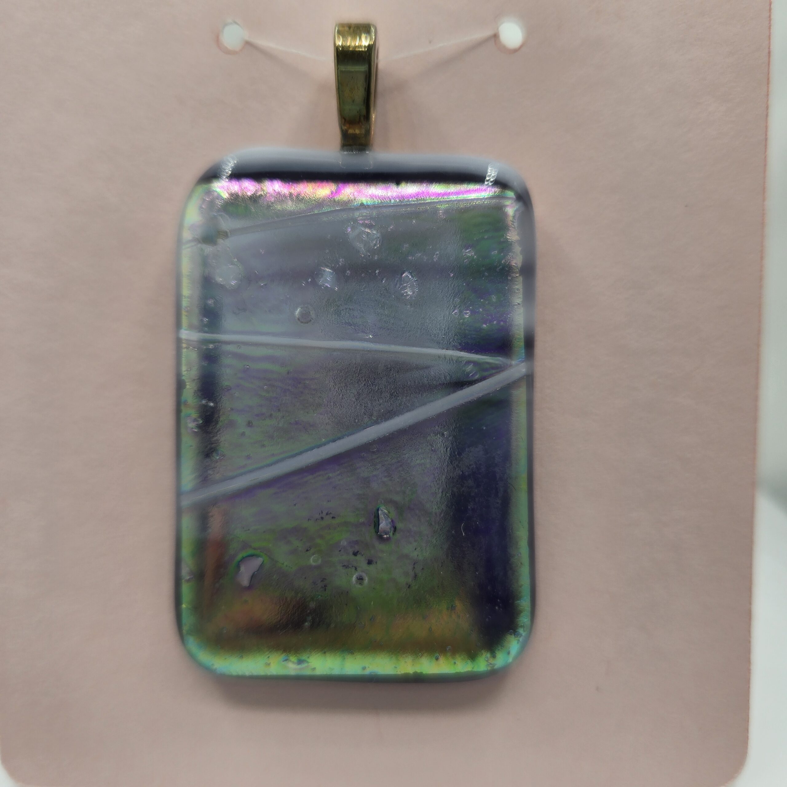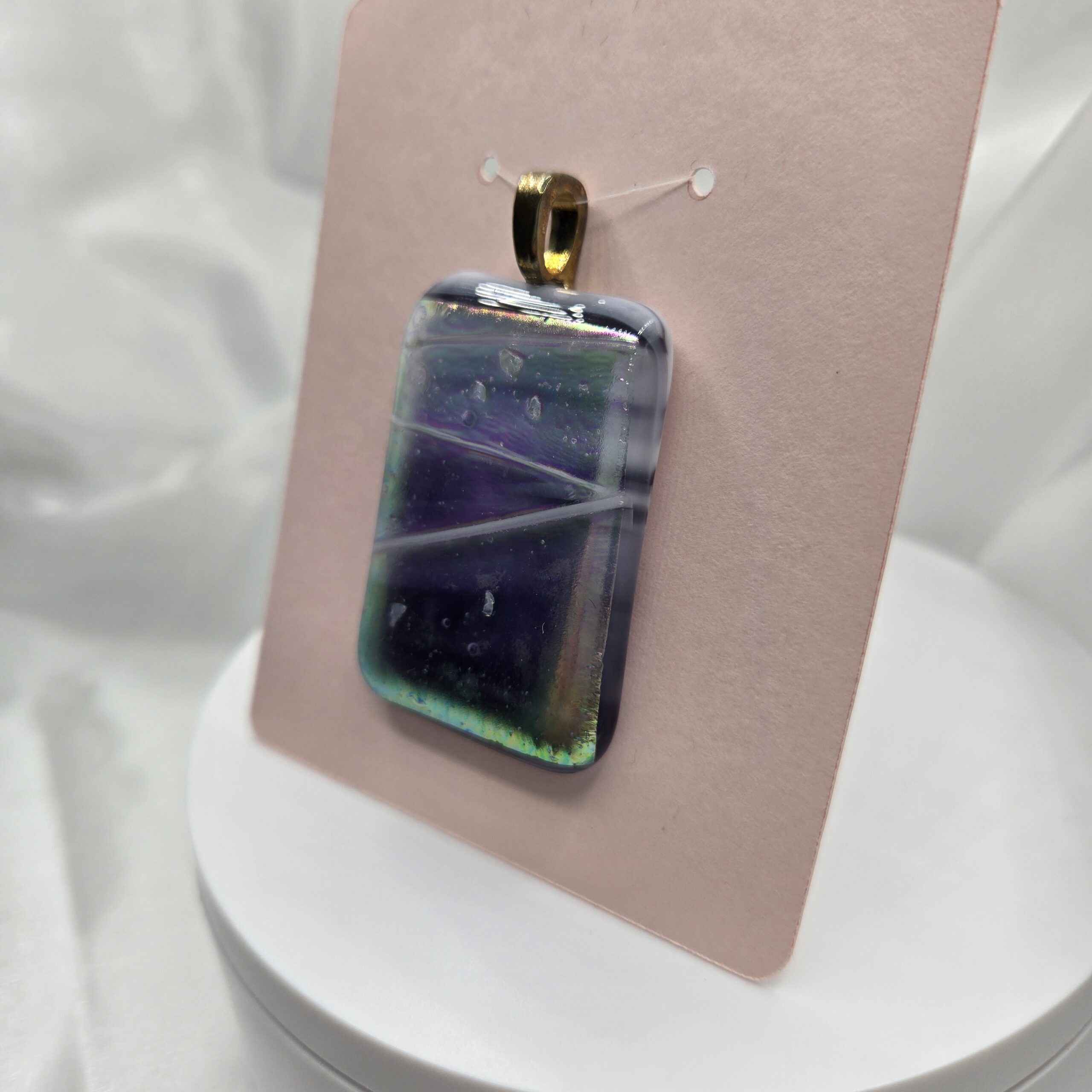 A striking 2″ × 1¼” dichroic glass pendant glowing with rich purple tones and shimmering color‑shift highlights. Layers of iridescent glass catch the light with flashes of violet, gold, and subtle metallic hues. Set on a deep purple base and finished with a large brass bail that adds warmth and contrast.  Pendant only – not on cord.